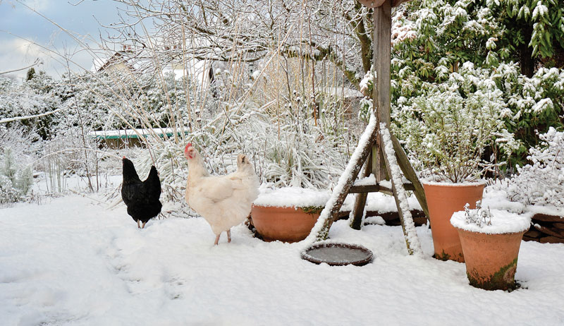 A flat path will allow the free-ranging flock to walk on top of the snow and around the yard. Sprinkle kitchen scraps, sprouted seeds, legumes or scratch grains along the trails to simulate the mental and physical exercise of foraging. Living foods will provide a nutrition boost.
